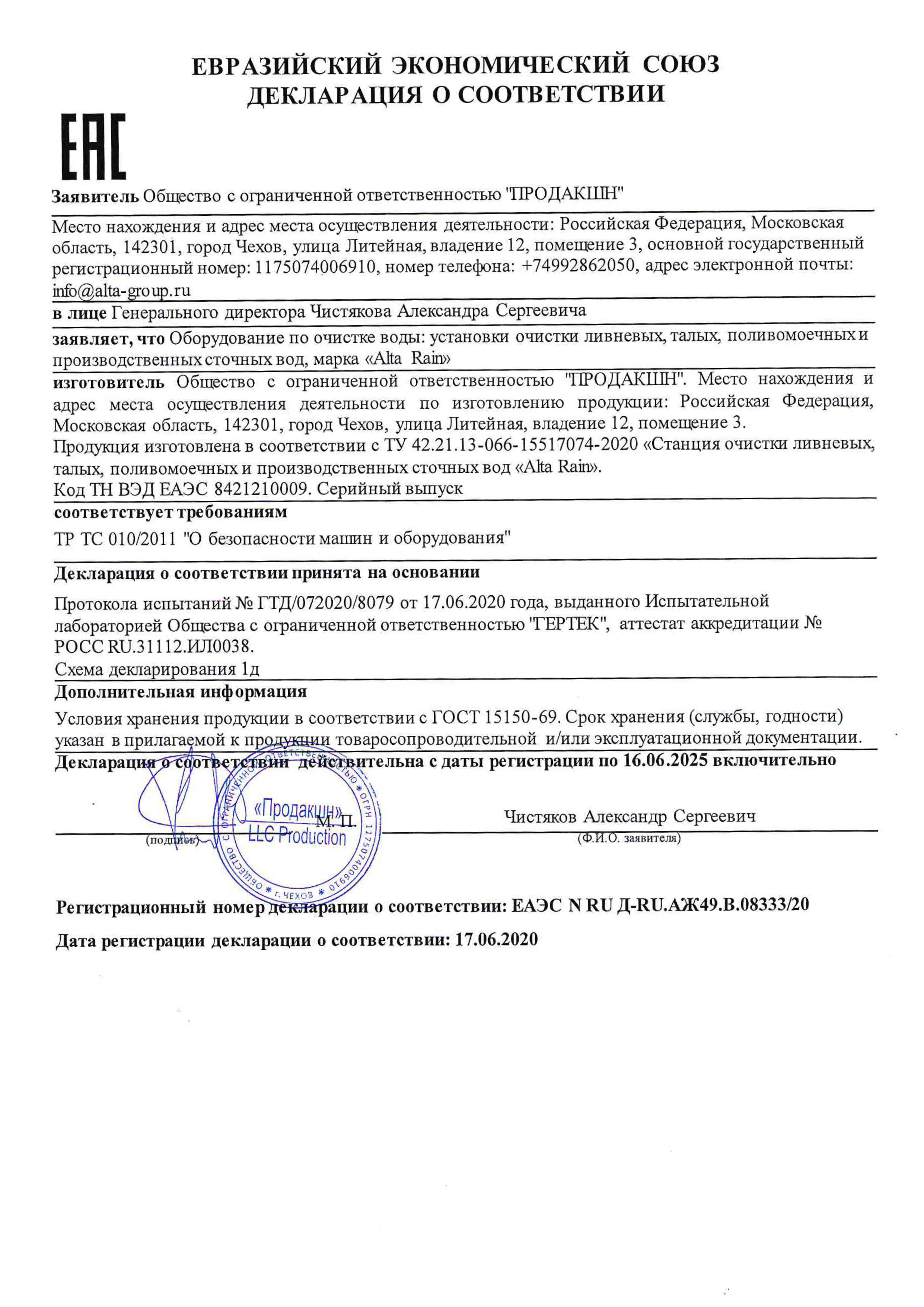 Состав очистных сооружений Alta Rain 6
